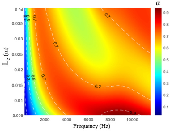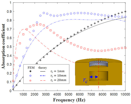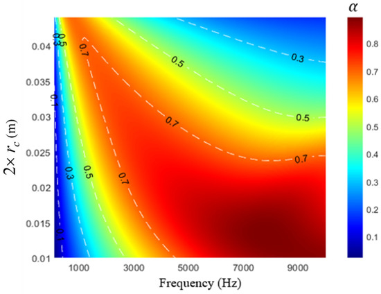 Figure 10 displays the theoretical predictions and finite-element simulations obtained under different cavity radii (). For = 10 mm, the theoretical sound absorption coefficient curve in Figure 10 does not include the first resonance peak of the simulated (FEM) sound absorption coefficient curve. When the cavity radius was 1 mm, the peak of the sound absorption coefficient appeared in the high-frequency region. By contrast, when the radius of the cavity was 20 mm, the stiffness of the overall metastructure decreased; thus, the absorption peak shifted toward low frequencies. Figure 11 displays the influence of cavity diameters on the contour profile of sound absorption. As the cavity diameters increased from 0.01 to 0.05 m at different frequencies, the peak absorption gradually moved towards the low-frequency region.