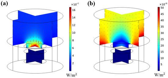 This section describes the sound absorption mechanisms of the developed hybrid sound-absorbing metastructure. As displayed in Figure 12, when the cavity radius was 10 mm, absorption coefficient peaks occurred at 3.1 and 5.5 kHz in the simulations. Figure 12a,b display the acoustic intensity distributions at 3.1 and 5.5 kHz, respectively. At 3.1 kHz, sound energy was attracted to the MPP because the fluid in the cavities of the MPP caused a local resonance effect; thus, sound energy was dissipated at 3.1 kHz. At 5.5 kHz, no acoustic energy attraction was observed, and most of the sound energy was absorbed by the substrate of the hybrid metastructure.
