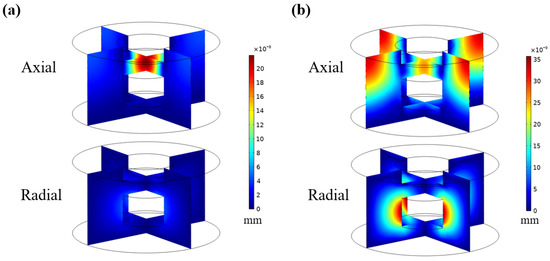 Axial and radial displacement distributions for the hybrid sound-absorbing metastructure at (a) 3.1 and (b) 5.5 kHz.