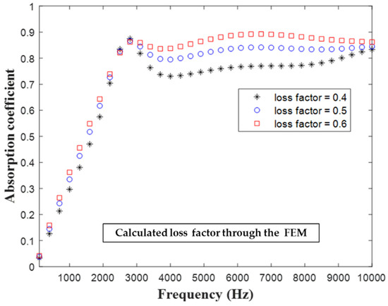 In contrast to the Young’s modulus of elastic materials, the Young’s modulus of viscoelastic materials has an imaginary part. The mechanical energy generated by sound wave vibration can convert energy into heat in a viscoelastic material, which increases the absorption of sound by the material. The imaginary part of Young’s modulus is also called the loss factor, which can be regarded as the damping of the material. Figure 16 depicts the influence of the loss factor on the hybrid metastructure’s absorption coefficient. The first peak of the sound absorption coefficient was almost unchanged under different loss factor values. In the frequency range of 3–10 kHz, when the loss coefficient increased, the sound absorption coefficient also increased.