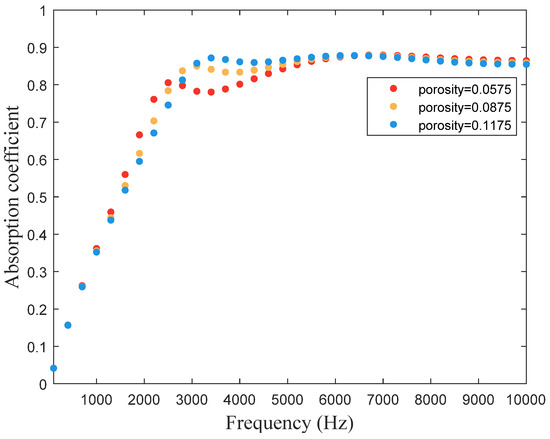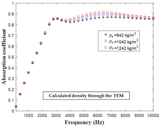 Figure 17 illustrates the influence of the density of the substrate on the hybrid metastructure’s sound absorption coefficient. Because the sound absorption peak in the low-frequency region was dominated by the MPP, the sound absorption coefficient in the high-frequency region was affected by the cavities. The sound absorption coefficient curve changed marginally at different substrate densities in the frequency range of 1–3 kHz. As the density of the substrate increased, the higher mass of the overall structure shifted the vibration mode to the low-frequency region; thus, the three curves in Figure 13 show the peak shift fluctuation that occurred in the frequency range of 3–10 kHz.