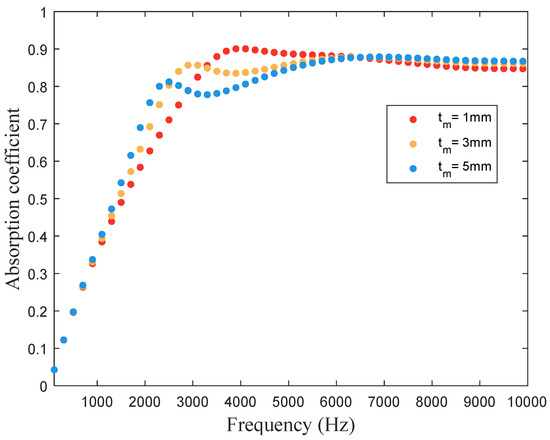 The thickness of micro perforated plate is proportional to the specific acoustic impedance provided by the microporous plate. Figure 19 illustrates the influence of the microporous plate thickness on the sound absorption coefficient of the proposed hybrid metastructure. When the microporous plate thickness changes, the change mainly affects the first peak of the absorption coefficient, but the coefficient profile is between 5 and 10 kHz. Considering the broadband absorption effect (e.g., absorption coefficient above 0.8), we set the thickness of the microporous plate to 3 mm.