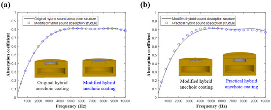 Sound absorption coefficients of (a) original and modified hybrid sound-absorbing metastructures and (b) modified and practical hybrid sound-absorbing metastructures.