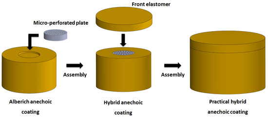 In the simulations of the design of the MPP, we assumed that internal perforated plate conditions existed in the sound pressure module. Therefore, the designed sound-absorbing metastructure must contain a water-filled cavity behind the MPP. In practical applications, the existence of a water-filled cavity tends to reduce overall structural strength. Therefore, we replaced the water-filled cavity in the original hybrid sound-absorbing metastructure with a homogeneous elastomer and examined the modified metastructure’s sound absorption coefficient. In this structure, only the holes of the MPP still contained fluid. Figure 20a depicts the sound absorption coefficients of the original and modified hybrid sound-absorbing metastructures. The impedance of water and that of the viscoelastic material are close; thus, the two sound absorption coefficient curves are consistent. To prevent the holes of the MPP from being damaged by seawater erosion under complex sea conditions, a layer of the adopted homogeneous elastomer was used to cover the top of the modified hybrid metastructure to increase the structure’s compression resistance and corrosion resistance. Figure 20b illustrates the sound absorption results obtained when adding a 5 mm thick elastomer in front of the modified hybrid metastructure. This elastomer had the sound absorption effect of a homogeneous sound-absorbing metastructure. Thus, the sound absorption performance of the modified hybrid metastructure was improved over a wide frequency range. Figure 21 illustrates the practical applications of the structural combination process.