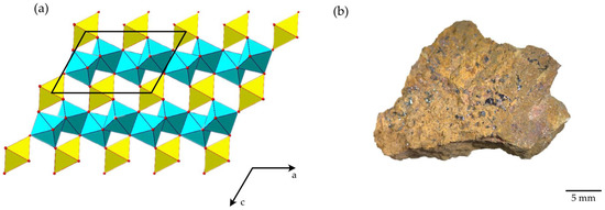 General projection of the crystal structure of brannerite along the b axis (UO6 = yellow octahedra; TiO6 = blue octahedra; structure drawing is based on data reported in Szymanski and Scott [2]) (a). Brannerite (black massive grains) in a host rock from Akchatau (Kazakhstan) (b).