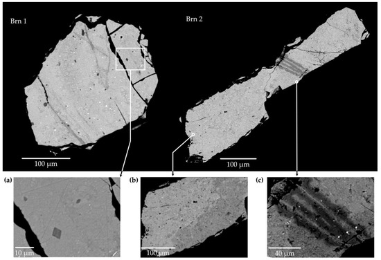 Two pristine grains (Brn1 and Brn2) and one calcined grain (Brn3) were investigated by EPMA, the BSE image is shown in Figure 2.