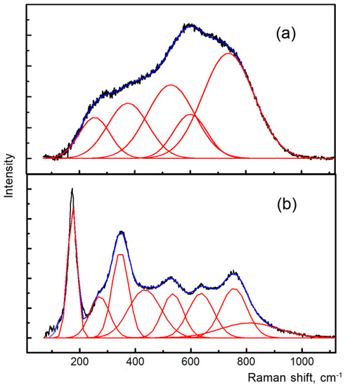 We obtained Raman spectra in the 90–3500 cm−1 range for both metamict and annealed samples. The Raman spectrum of the metamict brannerite shows only a few broad and overlapping bands (Figure 3a). Raman bands are observed only in the range 90–1200 cm−1.