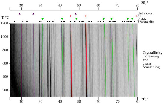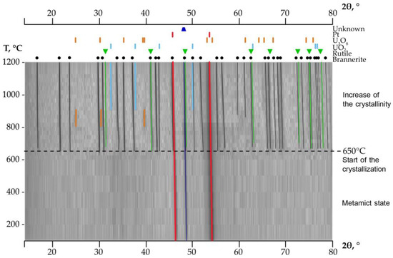 High-temperature XRD of the annealed brannerite. The admixture phases crystallized during the heating of the initial metamict brannerite are indicated above.