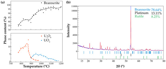 Figure 5 shows the ratio of thus formed U3O8 and UO2 with the temperature increase. The diffraction pattern of the sample after cooling shows that the oxides may present only at the levels below the detection limits. In addition, the rutile phase is also noted in the annealed sample. Rutile, TiO2, is typically associated with brannerite-rich ores in natural environments. The R-factors calculated by the Rietveld refinement increase with the temperature rise and fluctuate in the range of 6.2–12.6%.