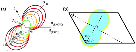 Table 4 shows the obtained values. The value of the volumetric expansion αv is the sum of the eigenvalues α11, α22 and α33. The linear expansion along the crystallographic axis b is α22. All the thermal expansion coefficients are positive except for αβ. Decreasing parameter beta indicates a “shear structural deformation”. This type of thermal deformation is typical for monoclinic crystals, as its thermal expansion is determined primarily by the change of the β angle. The angle between the 1st axis of the tensor and the crystallographic a axis decreases with the increase in the temperature; as a result, the structure expands mostly in the α11 direction, approaching the bisector of the β angle (Figure 8b). Thermal expansion tensors of brannerite at different temperatures are shown in Figure 8a. The decreasing β angle value is demonstrated by the rotation of the crystallographic a axis towards the c axis.