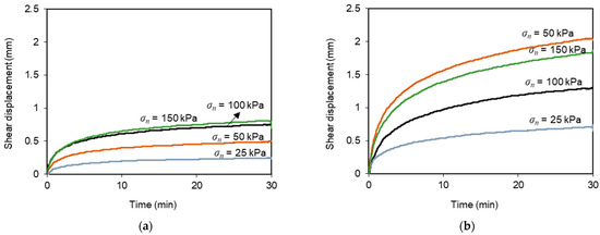 Figure 8 also shows that the creep displacement increased with the magnitude of sustained loading. Indeed, when subjected to a given normal stress, the maximum interface shear creep deformation was considerably higher under LC/Fmax = 0.62–0.73 (Figure 8b), when compared to that under a lower load level, LC/Fmax = 0.42 (Figure 8a). This finding is in agreement with the studies by Liu and Martinez [28] for sand–geomembrane interfaces, Lu et al. [31] for geomembrane–geotextile interfaces and Yang et al. [29] for composite geomembrane–granular material interfaces, in which the creep displacement was larger at higher shear stress levels under the same normal stress. The highest accumulated creep displacement was recorded in test T13 (LC/Fmax = 0.73, tc = 30 min and σn = 100 kPa) and did not exceed 2.3 mm (Figure 8b).