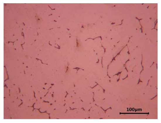 Unlike steels that are usually austenitic, corrosion-resistant cast steels with the same chemical composition contain small amounts of delta ferrite in their microstructure. Its presence results from the slow cooling of castings and segregation processes occurring during their solidification. In castings made of the austenitic Cr-Ni steel, 5–25% of evenly distributed delta ferrite is often found in the alloy matrix. The amount of this constituent depends on the thickness of the casting wall. The presence of delta ferrite is often desirable owing to its beneficial effect on the weldability of castings and the ability to hinder the spread of microcracks and improve the resistance to intergranular and stress corrosion (it favors the precipitation of carbides inside its own grains and not at the ferrite-austenite interface) [4]. In alloys with the addition of molybdenum, the volume fraction of delta ferrite is even higher and distinctly visible. Figure 1 and Figure 2 show the characteristic microstructure of ferrite-containing cast austenitic steel after solution treatment. Different amounts of delta ferrite are observed in the cast steel without and with the addition of molybdenum (Figure 1 and Figure 2, respectively).