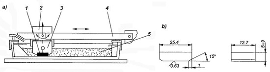Diagram of the machine used in the Miller test. (a) 1: specimen, 2: weight, 3: specimen holder, 4: holder arm, and 5: abrasive. (b) Dimensions of the specimen tested for abrasive wear.