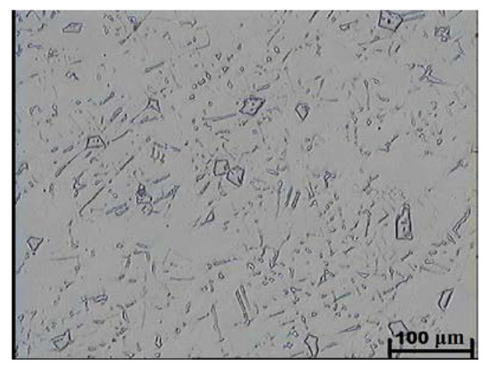 Following the example of tool steels, the essence of the solution proposed by the author consists in the use of a technology that allows the particles of primary carbides to be formed during metallurgical process within the entire volume of steel melt and later in the casting. In earlier research [21,22,23,24] on the properties of cast austenitic high-manganese steel with the addition of vanadium, titanium, and niobium, the author and co-workers focused on changes in the microstructure and abrasion resistance (determined in Miller test) of cast high-manganese steel. The structure obtained in the tested cases after heat treatment consisted of an austenitic or austenitic-martensitic matrix with primary carbides of the introduced elements evenly distributed in this matrix. The abrasion resistance measured in the Miller test was at least twice as high as in the reference cast Hadfield steel.