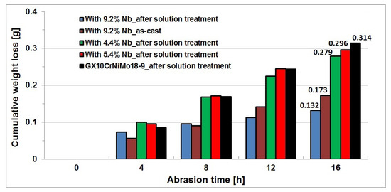 The abrasion resistance was measured in a Miller test on samples after solution treatment from the temperature of 1050 °C, as this type of heat treatment is recommended as a standard procedure for cast Cr-Ni steel, and on the sample with the highest niobium content, i.e., 9.2%, in the as-cast state. From the obtained partial weight losses of samples, the total weight loss was calculated for each test cycle, and using these data, a graph was plotted to show the cumulative weight loss of samples as a function of abrasion time. Figure 15 shows the cumulative weight loss of test samples plotted against the abrasion time.