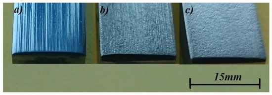 Surface of samples after the abrasion process; (a)—reference sample of cast GX10CrNiMo18-9 steel, (b)—cast Cr-Ni steel with the addition of 5.4% Nb, (c)—cast Cr-Ni steel with the addition of 9.2% Nb.