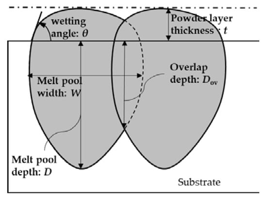 A series of single-track experiments and the image analysis of the cross-sectional images are required to obtain the process window. The melt pool depth (D) and width (W) are evaluated by the cross-sectional image analysis. The melt pool shape is characterized using the D and W. Eager and Tsai developed a simple geometrical model for predicting melt pool geometry [15]. We refer to the geometrical Eager–Tsai (E-T) model. Multiple scans are applied in the L-PBF process; however, the original E-T model is for predicting the melt pool geometry of a single scan in the welding process. Seede et al. extended the E-T model to apply to the L-PBF process by incorporating the hatching distance (h) between the two scans [2]. A schematic of the extended E-T model is shown in Figure 1.
