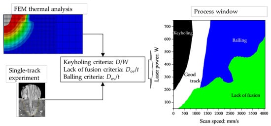The purpose of this study is to determine the balling and the lack of fusion criteria using the single-track experiments and the finite-element method simulation of thermal conduction for Inconel738LC alloy. The single-track experiments and the FEM analysis procedures are detailed in Section 2. In Section 3, the results of the experiments and the FEM simulations are discussed with the criteria for identifying balling and lack of fusion. As a result, the balling criterion of L/D > 7.69 and the lack of fusion criterion of Dov/t < 0.1 were obtained. Moreover, as shown in Figure 2, the framework to generate the process window using the FEM simulations and the criteria for keyholing, lack of fusion, and balling are developed in Section 3. Finally, the conclusion of this study and the future investigation are described in Section 4.