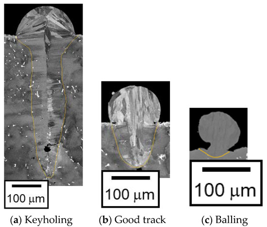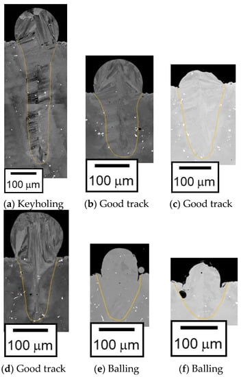 An example of the cross-sectional image is shown in Figure 1. The melt pool width (W) and depth (D) are measured from the image. The keyholing, good track, and balling examples are shown in Figure 3a–c, respectively.
