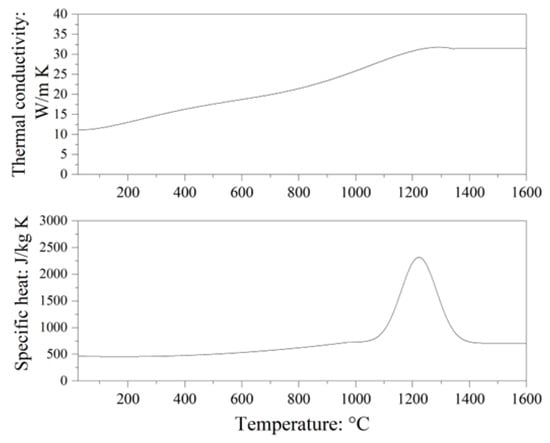 The specific heat and thermal conductivity (λ) used are shown in Figure 5. The thermal conductivity of powder layer was λ/20. The density of the solid materials and the powder layer were 8220 kg/m3 and 4110 kg/m3, respectively. The solidus and liquidus temperatures were 1098 °C and 1347 °C, respectively. The latent heat used was 250,000 J/kg. These properties are based on the calculation using the CALPHAD software: JMatPro (https://www.sentesoftware.co.uk/jmatpro (accessed on 7 January 2023)).