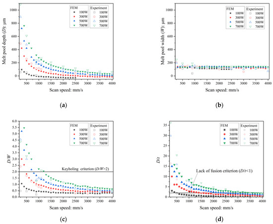 As shown in Figure 6c, the D/W of the experiments and that of the FEM are slightly different mainly because of the difference of W for V < 500 mm/s. The case of D/W > 2 arises for V < 1000 mm/s. For most cases in V < 1000 mm/s, the D/W of the FEM exceeds 2.0 when that of the experiment also exceeds 2.0, which means that keyholing in the single-track experiments can be identified by the FEM analysis using the criterion of D/W > 2. The same applies with the discussion in the D/W, the cases of D/t < 1 in the FEM when D/t < 1 in the experiments, as shown in Figure 6d. As the discussions above, the melt pool depth and width in the single-track experiments are approximately modeled by the FEM analysis.