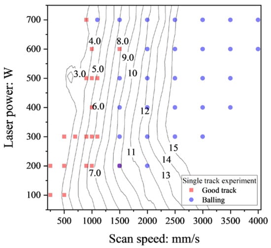 Figure 7 shows the contour diagram for L/D obtained from the FEM analysis and the classification of the balling and the good track in the single-track experiments.