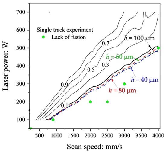 Figure 12 shows the contour map of Dov/t using h = 100 μm (black lines), and the isolines of Dov/t = 0.1 using h = 100 μm (black), 80 μm (red), 60 μm (green), and 40 μm (blue) obtained from the FEM analysis. The lack of fusion in Figure 12 was classified using D/t < 1. As can be seen in the contour map in Figure 12, the boundary between the balling and the lack of fusion is classified by Dov/t = 0.1 using h = 100 μm. Although the isolines of Dov/t = 0.1 cross a minimal region of the balling, the criterion Dov/t = 0.1 can reasonably identify the lack of fusion. Moreover, the isolines of Dov/t = 0.1 hardly differ irrespective of the h. The plots of the lack of fusion in Figure 12 were identified using D/t < 1, i.e., Dov/t < 0.1, the criterion identical to D/t < 1.