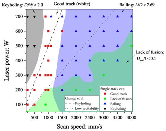 The process window using the criteria of D/W > 2.0, L/D > 7.69, and Dov/t < 0.1 (D/t < 1) is shown in Figure 13. The regions of D/W > 2 (gray) and Dov/t < 0.1 (green) were generated from the contour maps of the results of the single-track experiments. Moreover, the Dov was calculated assuming that h = 100 μm. The region of the lack of fusion in Figure 13 was different from that of Dov/t < 0.1 in Figure 12 because the isoline of Dov/t = 0.1 in Figure 12 was based on the results of the FEM simulations. The region of L/D > 7.69 (blue) was based on the results of the FEM simulations. The keyholing and the balling were well classified using D/W > 2.0 and L/D > 7.69, respectively. On the other hand, Dov/t < 0.1 strictly agreed with the experimental classification. The reason for the disagreement should be the small amount of the lack of fusion data. The number of instances of lack of fusion was just 6 out of a total of 68 experiments. The criterion of Dov/t should be verified when the number of lack of fusion data is increased. Grange et al. conducted single-track experiments using Inconel738LC and classified the keyholing and a low wettability using the boundaries of P/V = 0.5 J/mm and P/V = 0.22 J/mm, respectively [23]. The keyholing area in this study was smaller than that in [23] because of the difference of criterion between this study: D/W > 2 and [23]: D/Happ > 3. Happ is the height of the upper part of the melt pool and is similar to the powder layer thickness: t in Figure 1. The low wetting boundary crossed the balling region in Figure 13. The low wettability is the area of P/V < 0.22 J/mm and its feature is small D and high wetting angle (θ > 90°). As shown in Figure 1, the wetting angle tends to be high in the balling in this study, which means that the low wettability has features of the lack of fusion and the balling. The proposed method can quantitatively classify the lack of fusion and the balling: this is an advantage of this study.