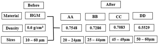 The HGM had a density of 0.6 g/cm3 with particle sizes of 10–60 µm. The physiochemical characteristics and viscosity of the constituent components were discussed in our previous work [9]. The HGM was varied into four particle sizes using different sieve ranges and characterized by the particle distribution analysis (PSA) detailed process was reported earlier by the author [20]. Furthermore, particle variation analysis was conducted using a gas pycnometer (Ultrapyc 5000 with 19 psi pressure by Anton Paar, Graz, Austria) to determine the densities of the varied sizes. Figure 1 shows the schematic representation of the HGM before and after particle variation analysis.