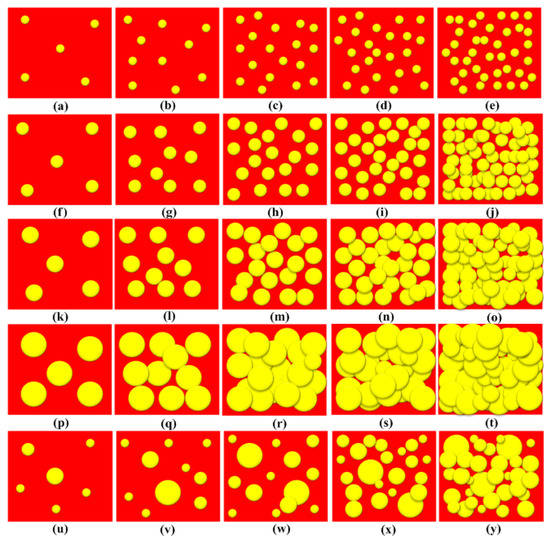Figure 2a–t show the schematic microstructure of the e–SFCs filled with uniform HGM particle sizes, while Figure 2u–y show the microstructure of the e–SFCs filled with heterogeneous HGM particle sizes. It could be noticed that the uniform HGM particle sizes consisted of closer particle ranges (i.e., 20–24 µm, to 50–60 µm). This was responsible for the few different circles in these sizes.