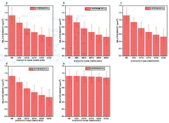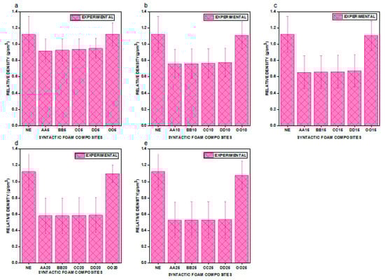 We graphically represent the density values of the e–SFCs filled with uniform particle size and varying concentration versus neat epoxy (NE) in Figure 3, and uniform concentration and varying particle sizes in Figure 4, to gain a better understanding of particle sizes versus the concentration of density of e–SFCs. Figure 3a–d show a drop in density values for e–SFCs with a uniformly sized HGM (irrespective of HGM concentration) when compared to NE, which may be attributed to a decrease in the vol% of epoxy, which corresponds to the substitution with an equivalent vol% of HGM.