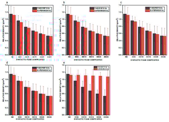 Graphical representation of experimental density versus theoretical density for (a) AA5, AA10, AA15, AA20, and AA25; (b) BB5, BB10, BB15, BB20, and BB25; (c) CC5, CC10, CC15, CC20, and CC25; (d) DD5, DD10, DD15, DD20, and DD25; (e) OO5, OO10, OO15, OO20, and OO25.