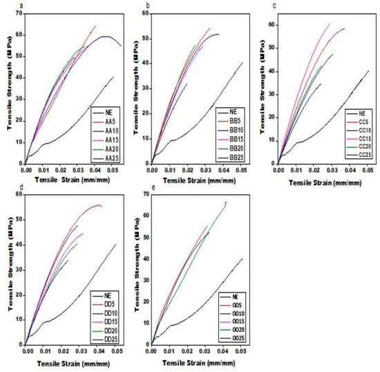 Graphical representation of tensile stress and strain for the comparison between (a) NE and AA5, AA10, AA15, AA20, and AA25; (b) NE and BB5, BB10, BB15, BB20, and BB25; (c) NE and CC5, CC10, CC15, CC20, and CC25; (d) NE and DD5, DD10, DD15, DD20, and DD25; and (e) NE and OO5, OO10, OO15, OO20, and OO25.