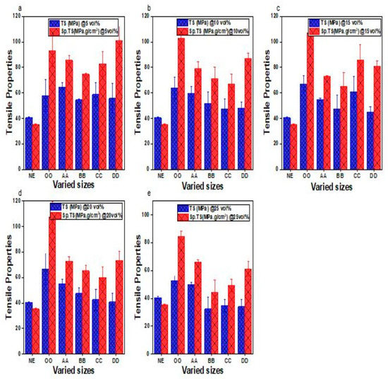 Graphical representation of tensile strength (TS) and specific tensile strength (SpTS) for NE, OO, AA, BB, CC, and DD: (a) 5 vol%; (b) 10 vol%; (c) 15 vol%; (d) 20 vol%; and (e) 25 vol%.