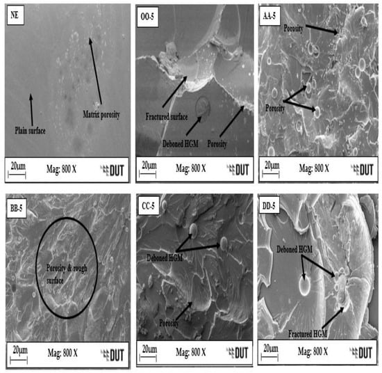 Figure 8 shows the SEM micrograph images of the fractured surfaces of the e-SFC tensile specimens compared to the NE. The NE shows a plain surface with matrix porosity, indicating the absence of an HGM. This resulted in their low tensile and specific tensile strength. A fractured HGM and a deboned HGM can be seen on the surfaces of OO–5, AA–5, CC–5, and DD–5, while BB–5 shows more porosity and a rough surface, resulting in reduced specific tensile strength compared to other e–SFCs because of possible poor interaction at that particle size of the HGM. A similar observation was reported by Ozkutly et al. [11], where poor incompatibility between the HGM and the PPMA matrix resulted in lower strength of syntactic foam. The DD–5 reflects good interfacial bonding and adhesion of the HGM and epoxy matrix with reduced porosity and surface roughness, leading to improved specific tensile strength of the e–SFCs.