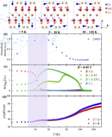 Figure 1c shows the anisotropic magnetization of a NdCrSb3 single crystal. It can be seen that the NdCrSb3 single crystal is easy magnetized along the a axis below ~10 K due to the ordering of Nd3+ moments. The decrease of the b-axis magnetization indicates that the Cr3+ moments are forced to rotate from the b axis to the a axis, thereby contributing to the ferromagnetic behaviors along the a axis together with Nd3+ moments. Upon heating, the spin reorientation transition occurs in the 9–20 K temperature range, where the Cr3+ moments rotate back to b axis from a axis. After that, the Cr3+ moments dominate the magnetization behaviors resulting in the b axis being the easy magnetization axis, and a small part of Nd3+ moments are induced by Cr3+ moments in the same direction. This can be demonstrated by the field-cooled (FC) and zero-field-cooled (ZFC) magnetization curve along the b axis. As shown in Figure 1c, the magnetization reaches ~2 at 20 K for the FC mode. This value is more than two times higher than that for the ZFC mode (~0.8 ). When the crystal was cooled in a magnetic field of 0.05 T, the Nd3+ moments rotate to parallel with the Cr3+ moments, resulting in higher magnetization values. While the crystal was cooled in zero magnetic field, the Nd3+ moments distribute spontaneously antiparallel with Cr3+ moments, leading to lower magnetization. This phenomenon was previously observed in DyFeO3 orthoferrites [], confirming that the Nd3+ moments distribute spontaneously antiparallel with Cr3+ moments, corresponding to the smaller ZFC magnetization, and can be easily reversed by an applied magnetic field, resulting in the two-times larger FC magnetization.