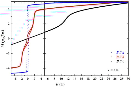 Due to the different preference of moments, the field-induced SR transition is also expected. Therefore, we further measured the M-H loops along three crystallographic directions at base temperature (2 K) with the magnetic field applied up to 30 T, and the results are shown in Figure 2. The M-H loop along the a axis is a typical ferromagnetism, owning to the ordering of both Cr3+ and Nd3+ moments along this direction. Upon sweeping the magnetic fields, the magnetization reaches a saturation value of ~4.2 along the a axis, which is, as discussed above, contributed by both Nd3+ and Cr3+ moments. With further increasing of the magnetic field, the magnetization along the a axis increase slightly to ~5 , which agree with that reported in the literature (~4.2 μB at saturation point) [,]. Interestingly, the M-H loop along the b axis shows different behaviors. The Cr3+ moments are believed to be firstly dragged to b axis by small magnetic fields, showing a rapid increase in the magnetization. Then a component of Nd3+ moments along the b axis is induced by the magnetic field up to 1.2 T, after which the magnetization increased dramatically until ~2.5 T. The magnetization along the b axis keeps going up slowly with increasing magnetic field, meaning that there are magnetic moments constantly emerging in this direction which may belong to the Nd3+. As the hard magnetization axis, the c-direction M-H loop along the c axis shows paramagnetic behavior. Note that there is an unusual increasing of magnetization between 10 T and 13 T, which is probably due to the spin reorientation of Cr3+ moments. The magnetization value at B = 30 T reaches the similar value of about 5 for all the three crystallographic directions, which could be the total magnetic moments in the NdCrSb3 single crystals.