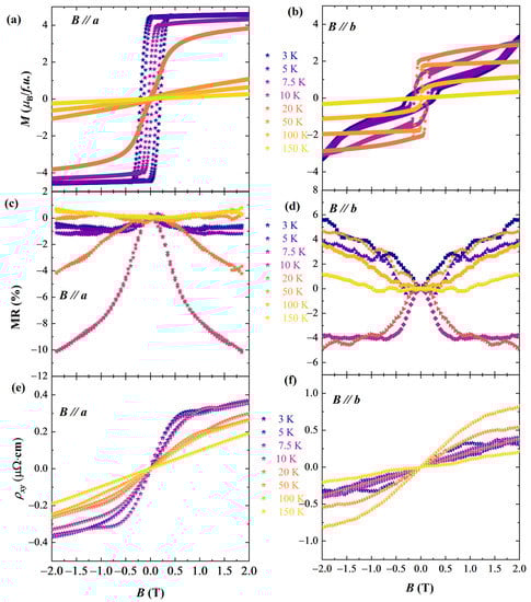 Figure 3c,d show magnetoresistance (MR) along the a and b axes at different temperatures, respectively. There are negative MR values within the spin reorientation temperature region (around 10~20 K) due to the fragile magnetic structure at this temperature region. As aforementioned, the Cr3+ and Nd3+ moments are comparable in this temperature region, which results in the flexible magnetic structure. Without applied fields, the moments are relatively disorder, and contributes to large electron scattering. The negative MR along the a axis is approximately 10% at 10 K with 2 T, while MR along the b-direction is about 5%. The negative MR has also been reported in Cr2Se3 [] and Ti-doped Cr2Se3 [] crystals due to the similar reasons. MR beyond the spin reorientation temperature range for both two directions are positive, further supports the high disorder states in SR region. The Hall effect along the two directions is shown in Figure 3e,f, from which anomalous Hall effects are observed. In the RFeO3 system [], the spintronic application requires heterostructure building due to the insulating nature of the crystals. In metallic NdCrSb3 crystal, the intrinsic negative MR and anomalous Hall effect directly reflects the spin information, and may potentially benefit the spintronic applications.