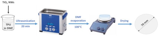 TPU was purchased from the Elastollan-BASF Chemical Company (Cleveland, OH, USA), while TiO2 NWs and N,N′-dimethyl formamide (DMF, 99.8%) were purchased from Sigma-Aldrich (St. Louis, MO, USA). According to the TiO2 NWs specification sheet, the diameter and length of the NWs were ~10 nm and ~10 μm.