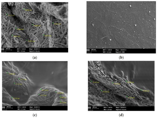 The SEM images of TiO2 NWs (a), as well as TPU (b) and the TPU–TiO2 NW composites, which have TiO2 NW concentrations equal to 2 wt.% (c) and 17 wt.% (d), respectively.