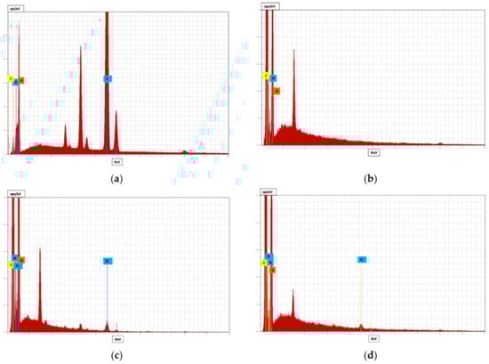 The EDS spectra of TiO2 NWs (a), TPU (b) and the TPU–TiO2 NW composites having the TiO2 NW concentration equal to 2 wt.% (c) and 17 wt.% (d). The unassigned maxima belong to the sample fixation substrate.