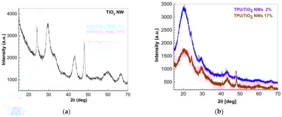 The XRD patterns of the TiO2 NWs and TPU–TiO2 NW composites, which have a TiO2 NW concentration equal to 2 wt.% and 17 wt.%, respectively, were carried out using a Bruker D8 Advance diffractometer (Bruker, Hamburg, Germany) in Bragg–Brentano geometry, which was equipped with a Cu tube, and which had a Cu Kα-line of λ = 1.5406 Å.
