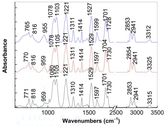 IR spectra of TPU (a, black curve) and TPU–TiO2 NW composites, which have TiO2 NW concentrations equal to 2 wt.% (b, red curve) and 17 wt.% (c, blue curve).
