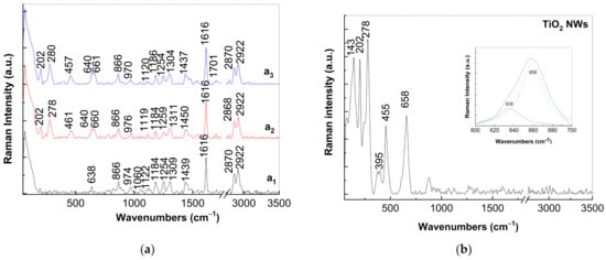 Raman spectra of: (a) TPU (a1); TPU–TiO2 NW composites have TiO2 NW concentrations equal to 2 wt.% (a2) and 17 wt.% (a3); and (b) TiO2 NWs.