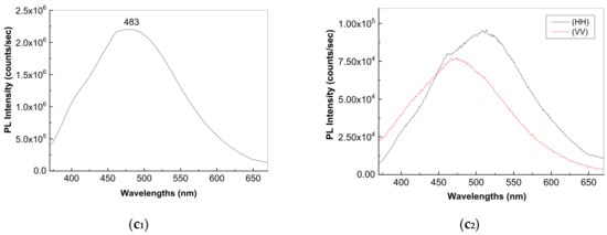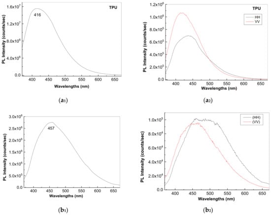 PL spectra of TPU (a1), PTU–TiO2 NWs 2% (b1), and PTU–TiO2 NWs 17% (c1). Anisotropic PL of TPU (a2), PTU–TiO2 NWs 2% (b2), and PTU–TiO2 NWs 17% (c2). In (a2,b2,c2), blue and red curves correspond to PL spectra recorded when measurement geometry for emission and excitation polarizers are both in horizontal (HH) and vertical (VV) position.