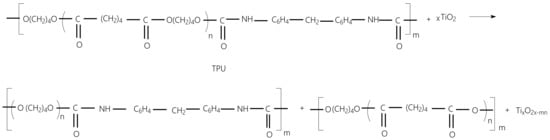 - Chen, X.; Wang, W.; Li, S.; Qian, Y.; Jiao, C. Synthesis of TPU/TiO2 nanocomposites by molten blending method. J. Therm. Ana. Calorim. 2018, 132, 793–803. [Google Scholar] [CrossRef]