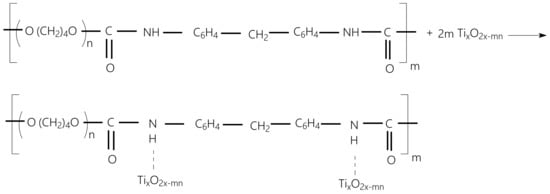 Similar to Scheme 2, new hydrogen bonds emerge between the -NH- bond of the TPU amide group and the oxygen atoms of TixO2x-mn. Such hydrogen bonds can be invoked to occur between the -NH- bonds of the TPU amide groups and the oxygen atoms of Ti2O3 and Ti0.91O.