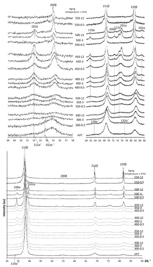 However, during annealing, the α-phase is actively formed. Its content reaches more than 20% and increases up to 40% during annealing at 350 °C for 12 h (Table 2). Note that the strain-induced α″-martensite stabilized by plastic deformation during HPT is preserved during aging up to 300 °C, 0.5 h (Figure 2).