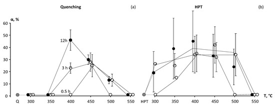 As well as in case of Q state, the α-phase formation in HPT specimens is most intensive at annealing temperatures of 400 and 450 °C (Table 2, Figure 3). The α-phase content in HPT specimens after annealing for 0.5 h is noticeably higher than in Q specimens. Thus, in Q + 400 °C 0.5 h state, the α-phase fraction is negligibly small, while in HPT 400 °C 0.5 h state, the α-phase fraction amounts to about 30%. After holding for 12 h at 400 °C, the α-phase content in HPT specimens reaches up to 45%. The contents of α-phase in Q and HPT specimens with an increase of annealing time up to 12 h at 400 and 450 °C become closer. No α-phase is observed after annealing of HPT specimens at 550 °C.