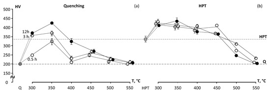 The HPT treatment results in an almost twofold increase in microhardness (from 200 to 334 HV) compared to the Q state (Figure 4b), which is the result of grain refinement and formation of the nanocrystaline structure. In the HPT state, microhardness increases as a result of aging at temperatures of 300 to 450 °C (Figure 4), due to the appearance of finely dispersed α -phase. However, the relative growth of microhardness in HPT specimens after annealing at 300 and 350 °C is appreciably lower than in the Q specimen. This is possibly due to a larger ω-phase amount forming in the Q state at these temperatures. HV of the Q + 12 h 350 °C and HPT + 12 h 350 °C states become close, although the mechanisms of hardening for these states are not the same. There are formations of a significant volume fraction of finely dispersed ω-phase in the state Q + 12 h 350 °C and nanostructured state with a formation of finely dispersed α-phase in HPT + 12 h 350 °C state.